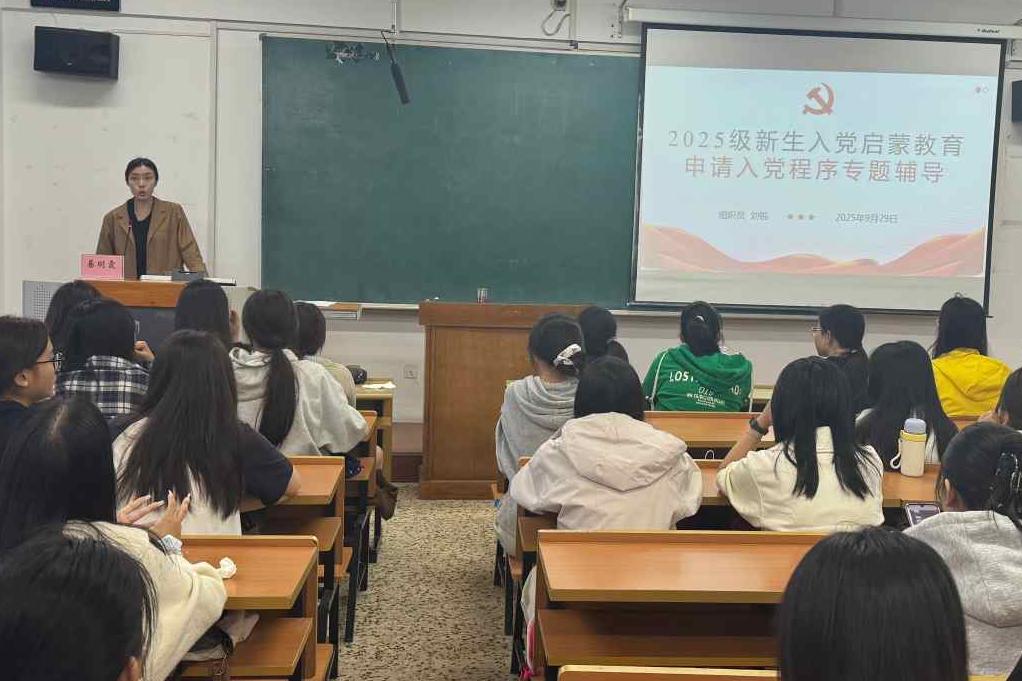 随后,刘锐老师针对发展党员的具体流程与要求,向新生展开介绍。她详细阐释申请入党的条件、入党程序及党员发展各阶段的具体内容。她指出,入党荣誉的背后是沉甸甸的责任,希望同学们不忘初心,积极为全面建设社会主义现代化国家贡献自己的青春力量。