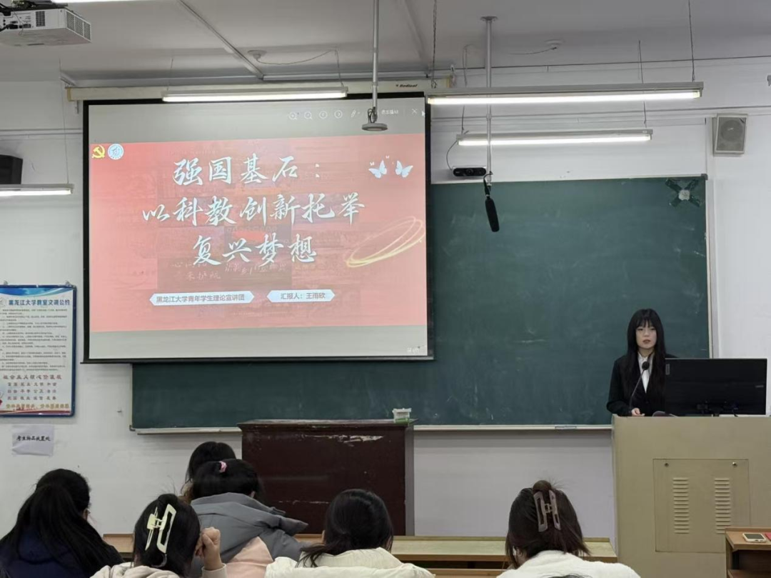 创新创业教育学院(创新创业教育中心)王雨欣同学以《强国基石:以科教创新托举创新梦想》为题进行宣讲。她从国家、地方、高校和个人四个层面,系统阐述了科技创新如何成为强国发展的重要支撑。国家“双创”政策为青年创新提供沃土,黑龙江大学通过完善科创体系、开放实验室、优化科创赛事等举措,成为创新人才的摇篮。她呼吁青年将个人理想融入国家发展与龙江振兴,以青春之我、智慧之力,为中华民族伟大复兴添砖加瓦。