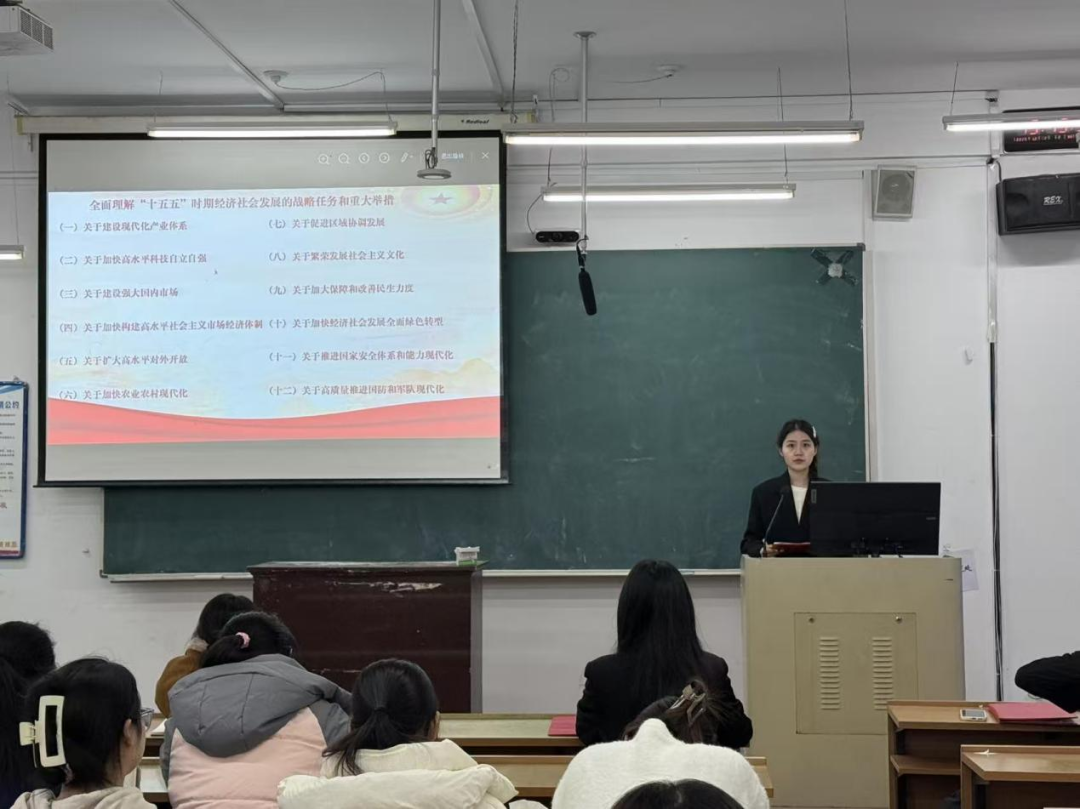 为深入学习贯彻党的二十届四中全会精神,进一步引导青年学生深刻把握国家治理体系和治理能力现代化的战略部署。创新创业教育学院(创新创业教育中心)于12月2日按照学校统一安排进行校青年学生理论宣讲活动,本次活动由校青年学生理论宣讲团成员王雨欣主持,2025级辅导员王冠琪老师出席,2025级全体学生参会。